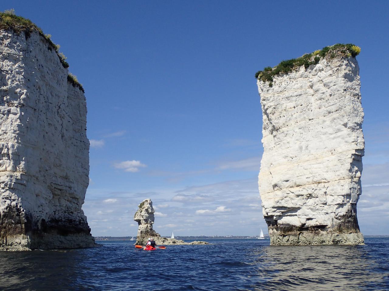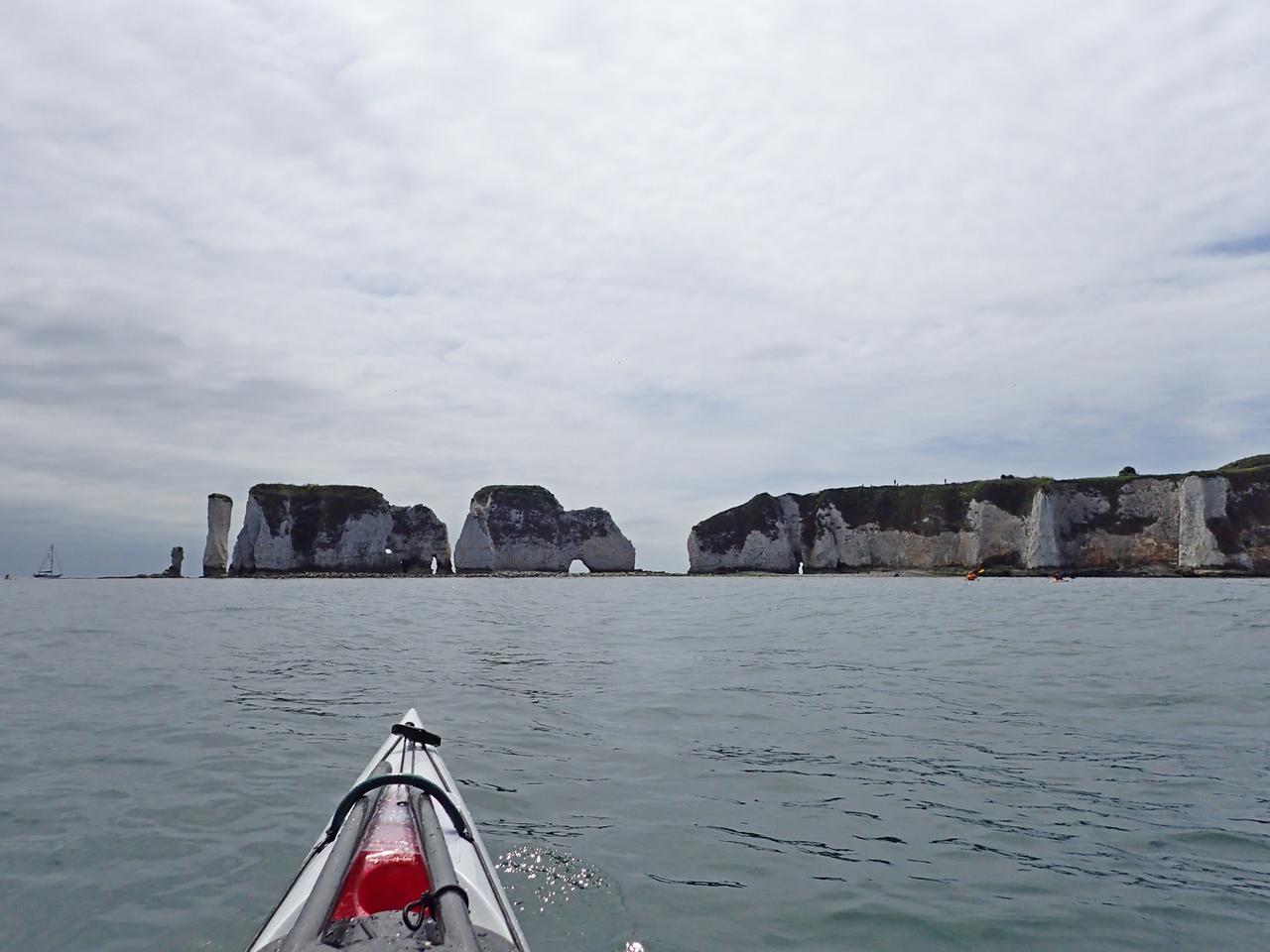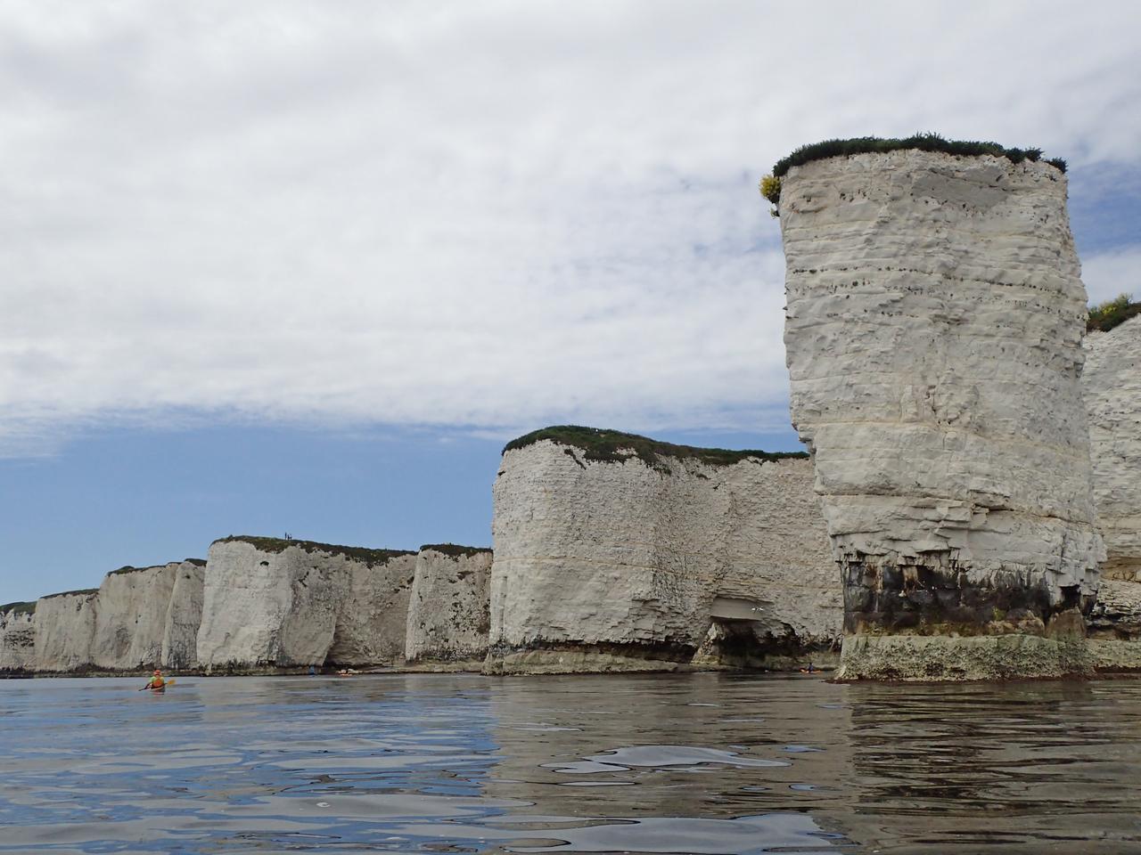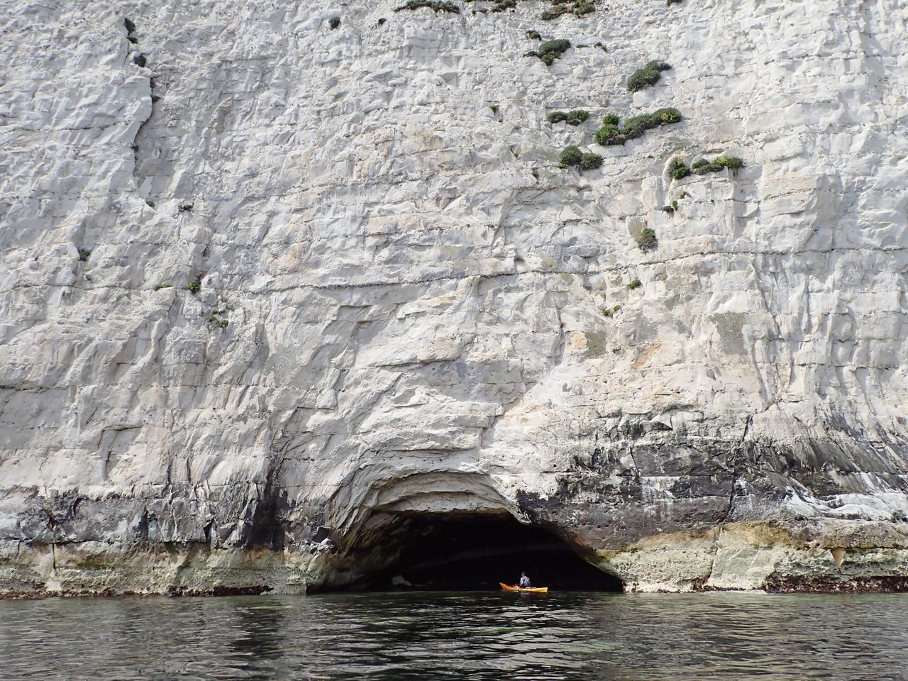 Approaching Old Harry Rocks one can see the small arches that can be paddled through on the highest tides