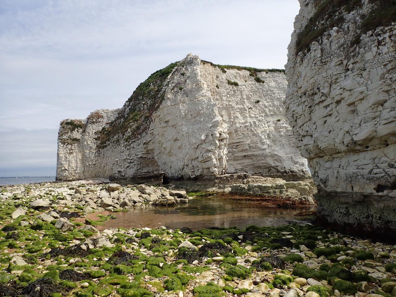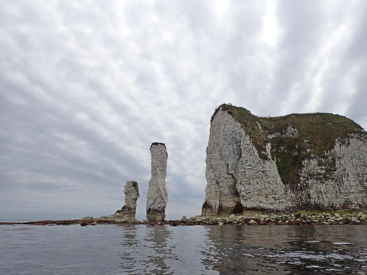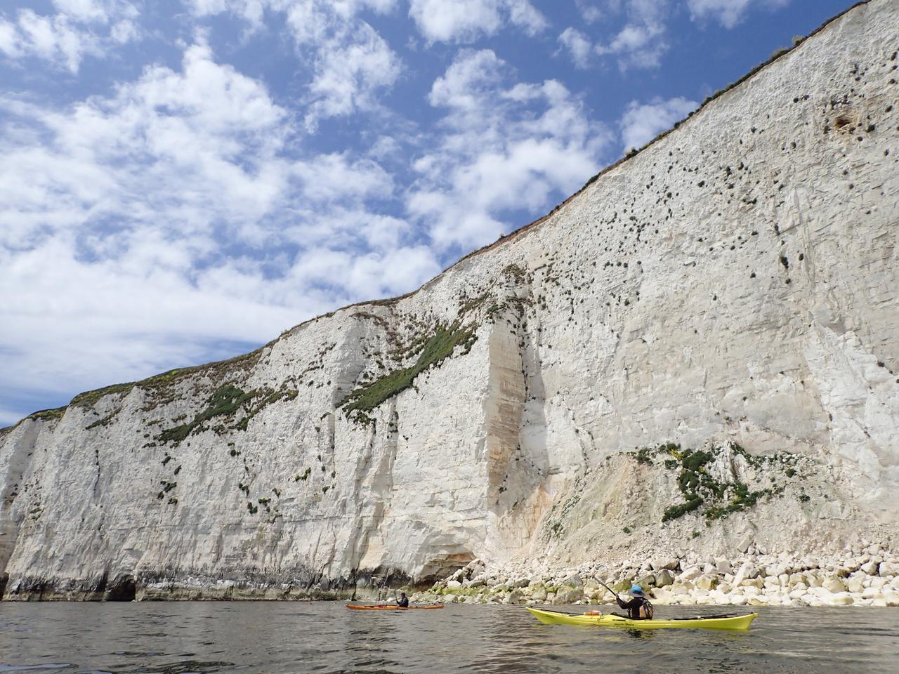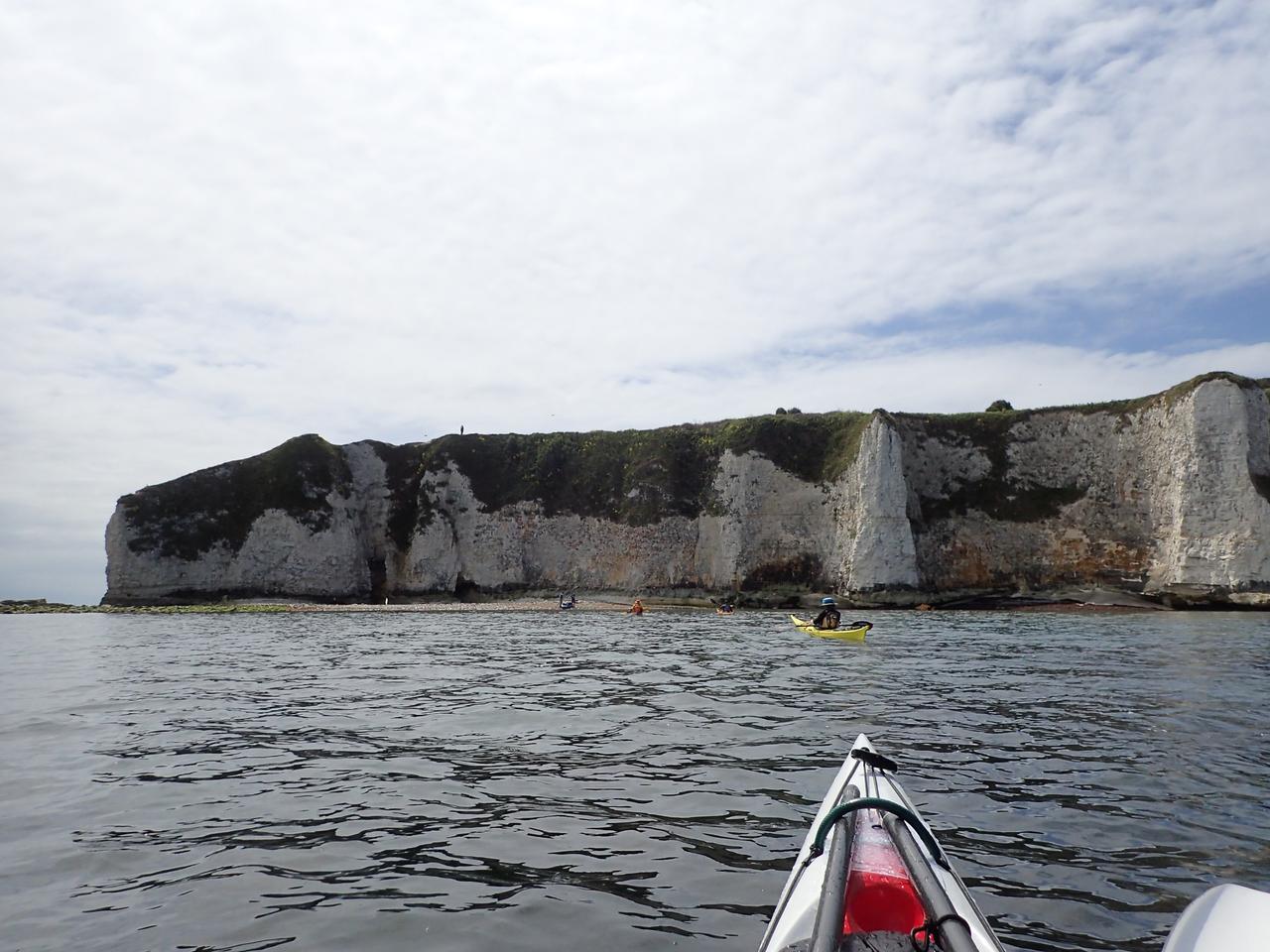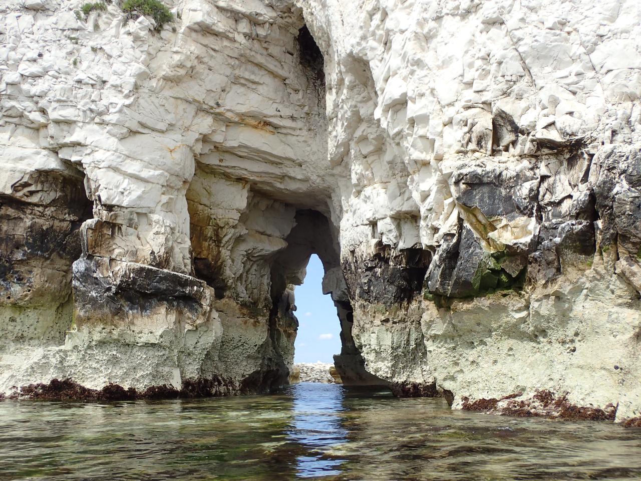 Approaching Old Harry Rocks one can see the small arches that can be paddled through on the highest tides