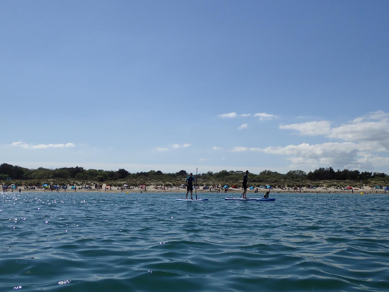 As expected there were many holidaymakers enjoying the weather. But as we progressed down the long beach at Studland the wind became offshore. There were many people on SUPs and the conditions were ripe for a situation. Sure enough we came across some teenagers in trouble (not the people in the picture). Two in the water about a hundred metres offshore, with their SUP about 20 or 30 metres further on, with a parent on another SUP thinking she could somehow get their SUP back to them - little chance. I towed the SUP with the teenagers on it back to the shallows with a friendly but firm warning about offshore winds ! Stuart helped the other SUPer back to the shore.