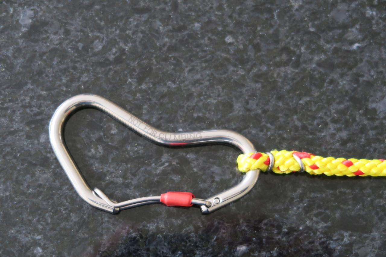 The towline was originally built with DMM bent gate carabiners as pictured. THESE CARABINERS ARE NOW DEEMED UNSUITABLE. The spring is some form of plastic and slipped out of position recently leaving the carabiner open. The rebuilt towline can be seen further down the page.