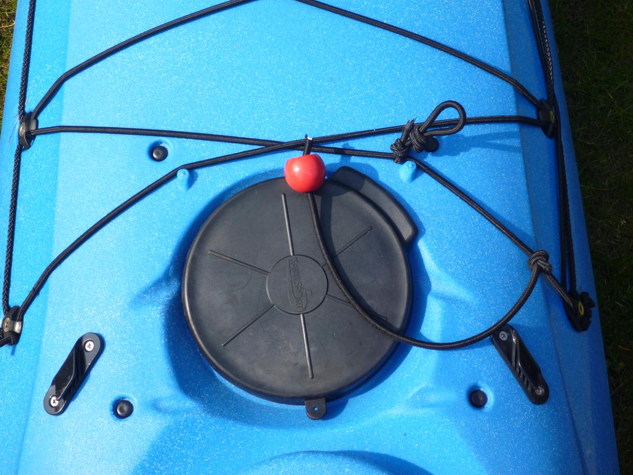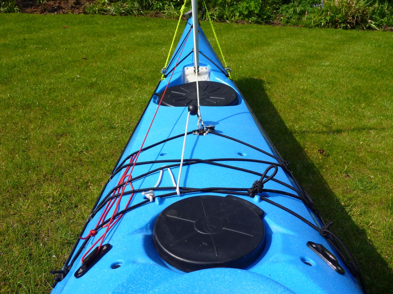 Here's one of the fittings to the side of the compass recess, I've made a loop of 3mm dyneema that goes underneath the open parts of the RDF and through the hole in the back part of the RDF with overhand stopper knots. Why dyneema here? because its important that there's as little give as possible in the side stays otherwise the mast will heel over more than the boat and the leeward sidestay will go slack. The loop is as near to the edge of the kayak as possible. This seems to be OK but really it would be better to install new surface mounted deck fittings further over the side to get as wide a spread as possible for the side stays which will be under a lot of strain. Similarly it would be better for the side stays to be attached further up the mast but that's limited by the design of the sail - more on this later.