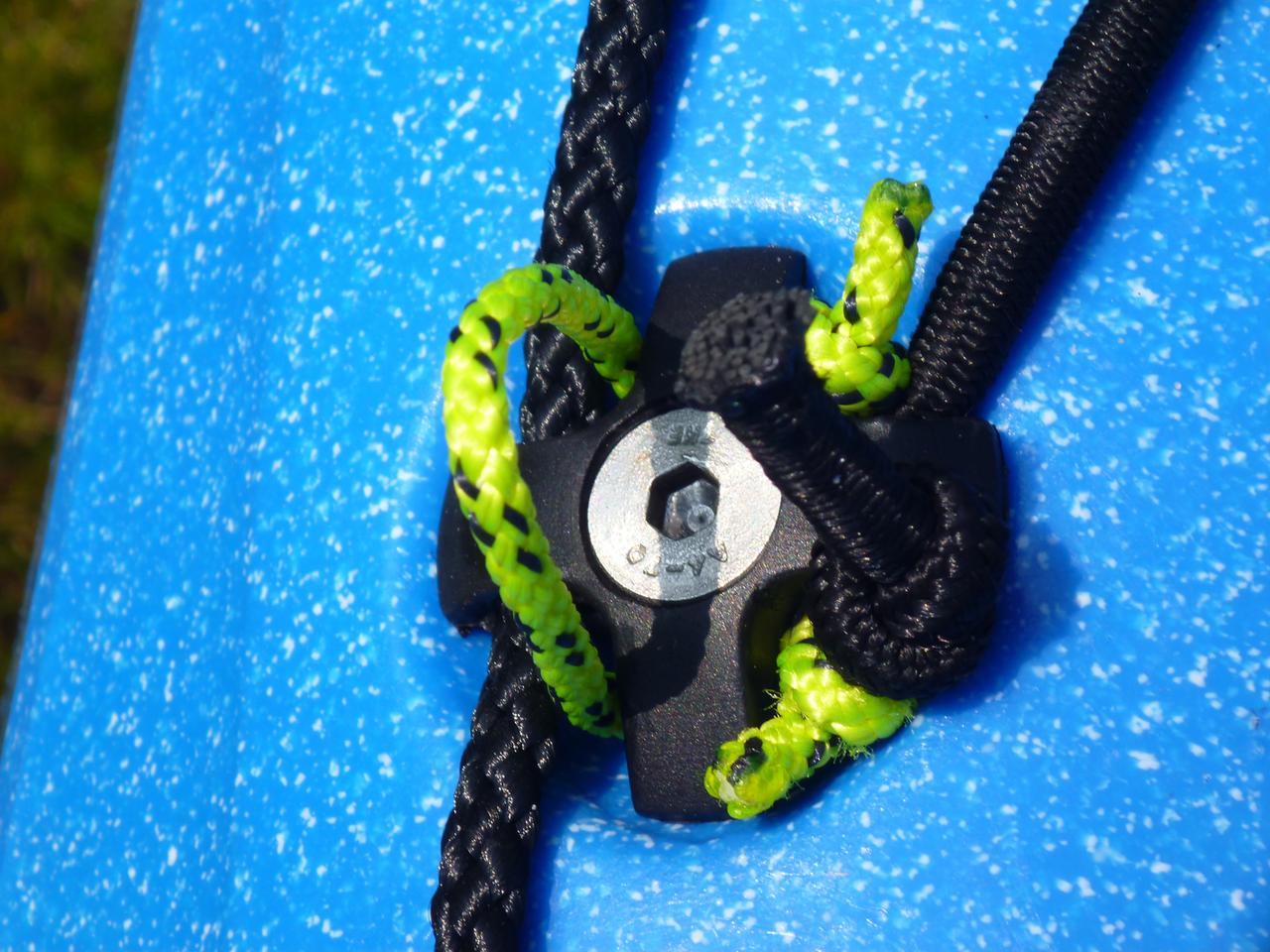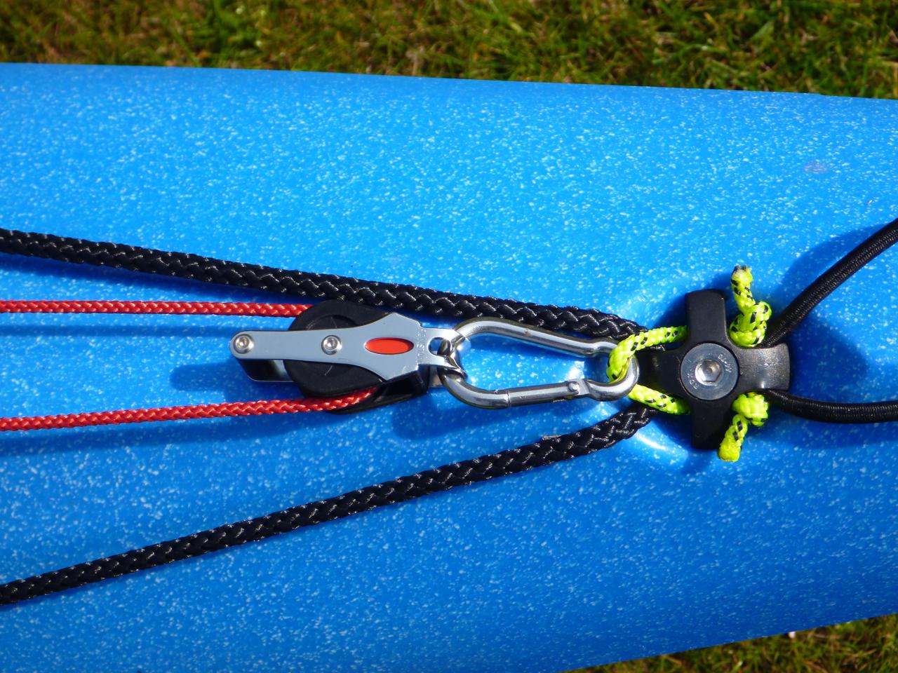 Here's the central mounting for the back stay and the main sheet pulley. This is well positioned beneath where the sheet attaches to the sail to apply vertical downforce when sheeted in as there's no kicking strap. This time I've used a simpler cord of 4mm to make a loop to attach the backstay and a double loop of some thinner better quality cord through the pulley. The pulley is a cheap version with no bearings, its sufficient to provide 'feel' on the main sheet but as there won't be a great deal of movement I thought it wasn't worth a more expensive version with inbuilt roller bearings. See a tip at the bottom of the article for cramming several cords through an RDF.