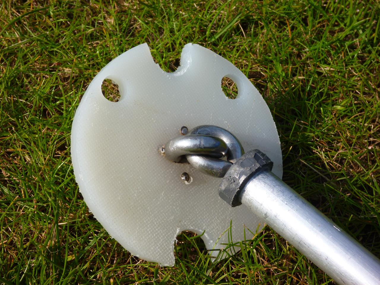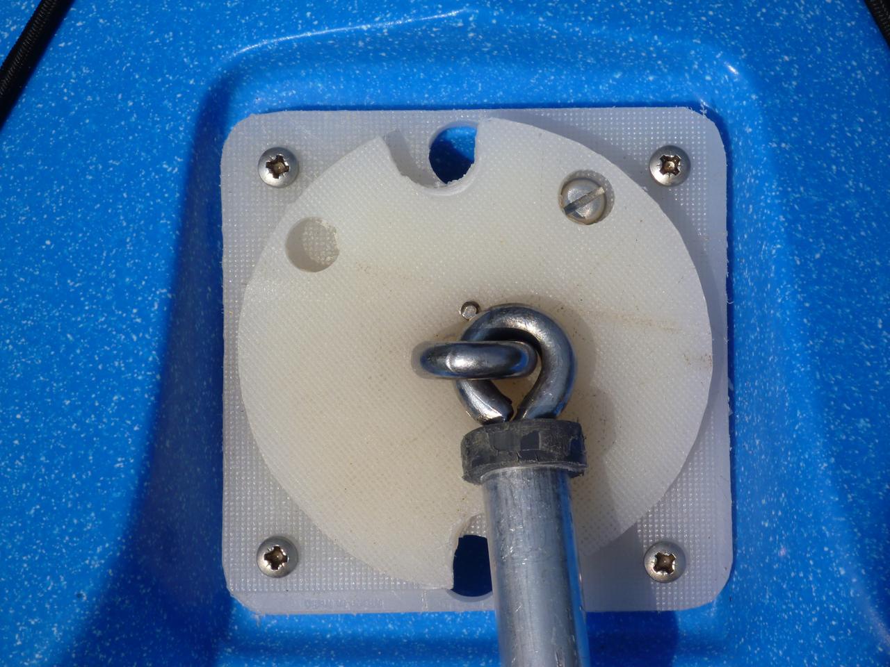 Here's the mast base mount in the compass recess. It's made from a basic kitchen chopping board about 8mm thick. There are two drain holes for water that can get into the recess, small stainless steel bolts (positioned to match a compass) and a 'keyhole' slot for the actual mast base. The screw head engages with the mast base to lock it into position.