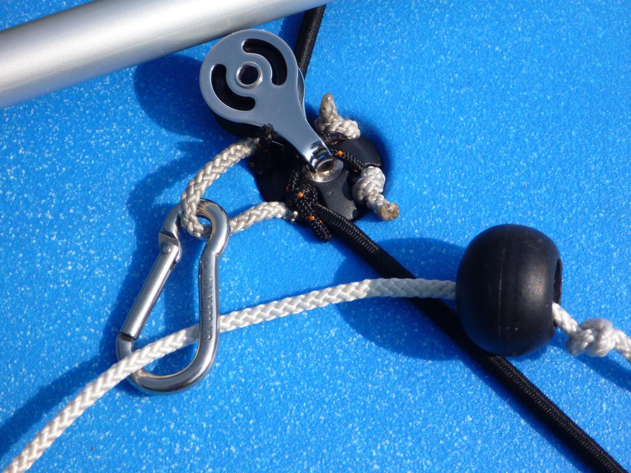 The backstay is dual purpose. When the mast is erected the ball stopper runs up against the shackle locating the mast in the upright position. The 'tail end' of this cord provides an essential means of getting the sail down. When the going gets a bit too exciting you might find yourself screaming off downwind and with all the force being forward on the sail even if its sheeted out and flapping around the front of the mast, this is the only way you're going to get the sail down.