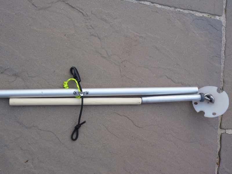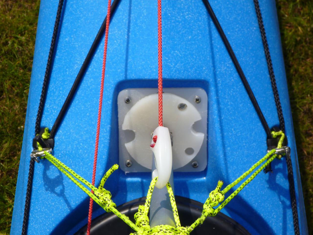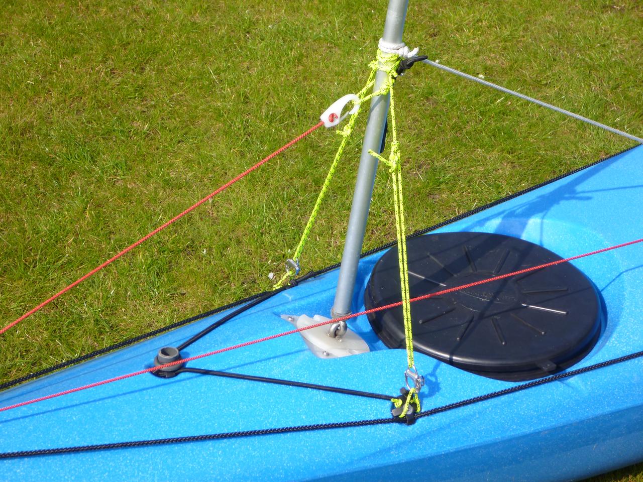 Mast now in position, its just short of the vertical as the backstay is a simple 4mm stretchy type cord designed to give a little in gusts. The frontstay / uphaul is also stretchy but only as supplied at 3mm. I've tried bungee cord in the uphaul but found that on tacking in a reasonable wind the mast will blow backwards.
