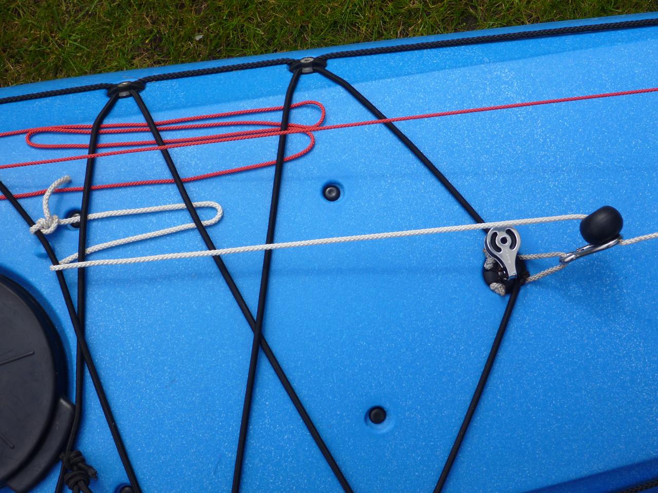 Note the clamcleats each side of the deck pod, one for the uphaul and one for the main sheet. The ball stopper and lead are for wrapping around the sail when stowing it on deck.