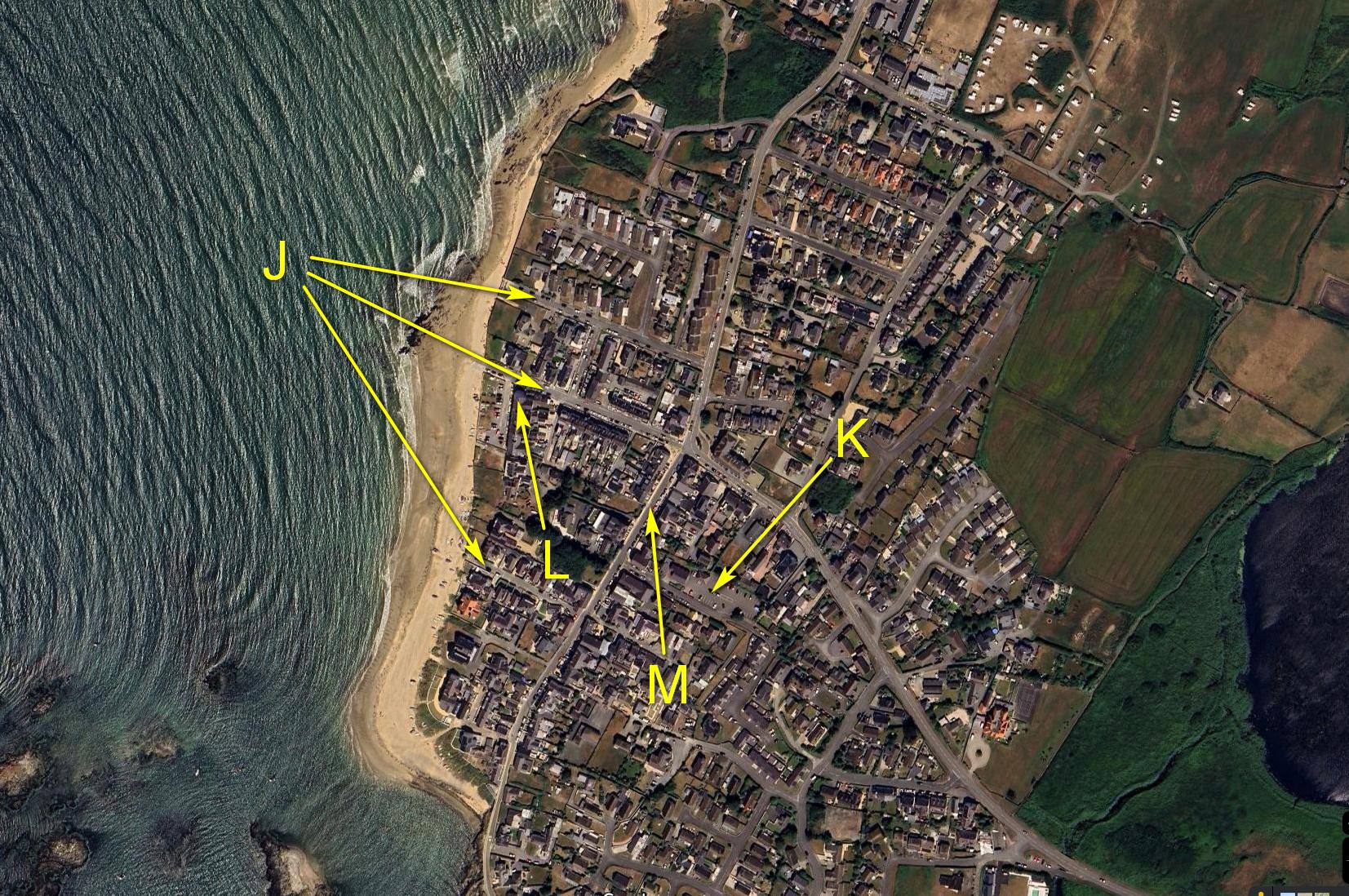 The waves at Rhosneigr are kind and ideal for learning or practising surfing in a sea kayak. They're not steep enough for a surf kayak. They break slowly as the sea bottom gets shallow on a consistent slope, so there isn't a dumping wave at the shore. There are rocky outcrops but they are fairly obvious. Avoid surfing into the beach just to the north of C.